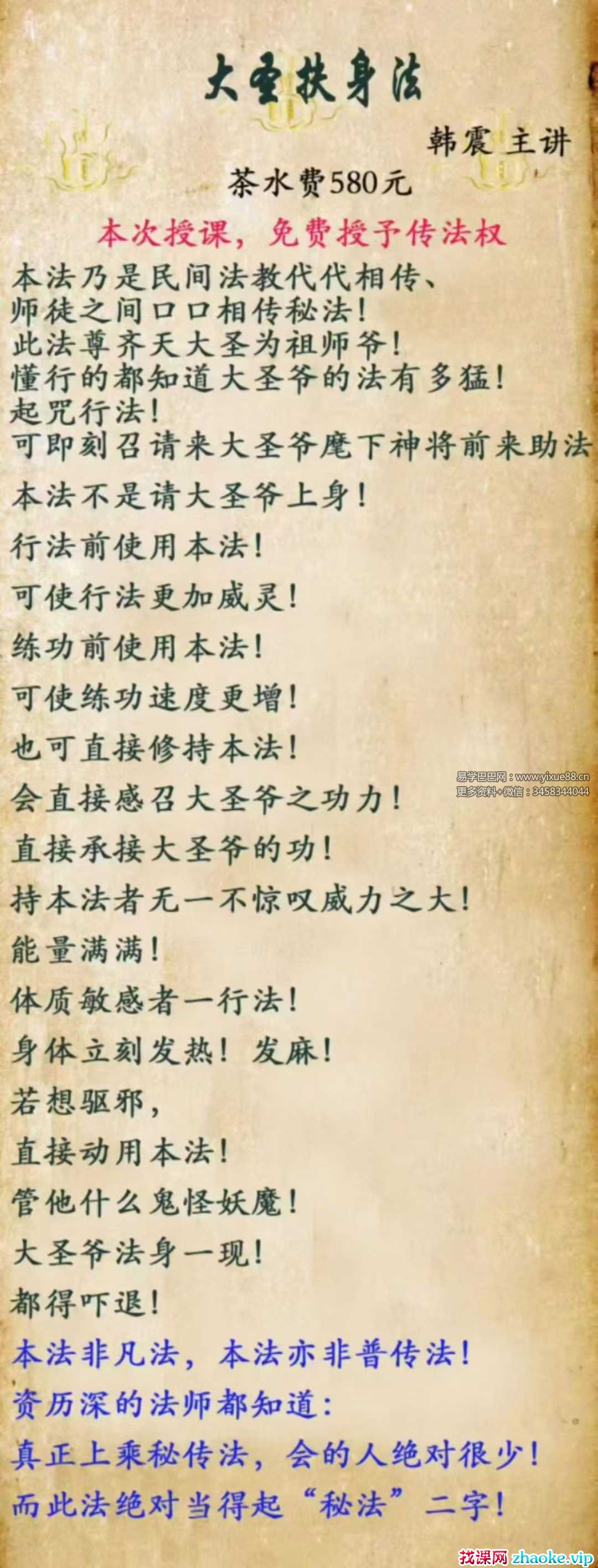 而今天所传《大圣扶身法》,就是大圣爷的法,此法敬大圣爷为祖师爷,接的是大圣爷的功,修的是大圣爷的缘!